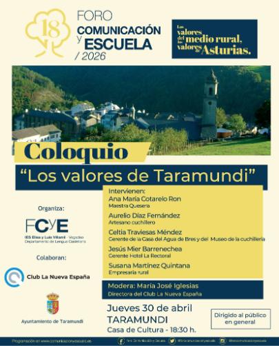 El próximo día 30 de abril tendrá lugar en la Casa de Cultura de Taramundi el primero de los seis coloquios que se desarrollarán, en colaboración con el Club La Nueva España, a lo largo de esta edición del Foro Comunicación y Escuela. Este ciclo tiene como objetivo poner de relieve cuáles son los valores y las posibilidades de un territorio rural, que si bien ha perdido mucha población en las últimas décadas, acoge en sí grandes oportunidades. Se llevarán a cabo cinco coloquios en las localidades de Taramundi, San Tirso de Abres, Santa Eulalia de Oscos, Castropol, Vegadeo y uno final en Oviedo en la sede del Club La Nueva España.
